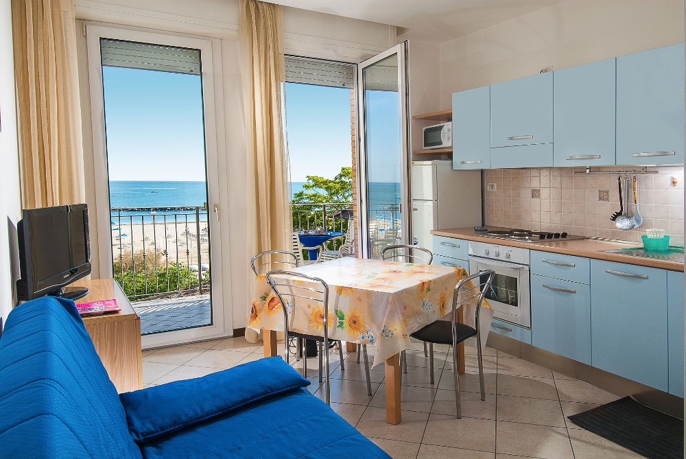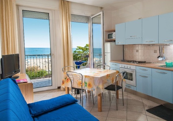 Appartamento Trilocale fronte mare, in centro a Gabicce, dotato di tutti i confort per le tue vacanze al mare. Cucina completamente accessoriata con stoviglie, parcheggio esterno coperto e custodito, ascensore, lavatrice, cassaforte, aria condizionata, Wi-fi, Tv.